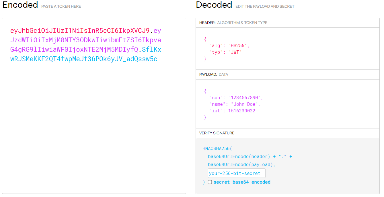 JWT即JSON WEB TOKEN,由三个部分组成,并用两个“.”进行连接。第一部分为header(base64加密),第二部分为payload(base64加密),第三部分为verify signature,它的构成如下: