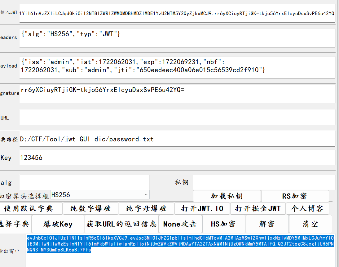 这次使用了HS256加密,主要就是爆破key,网上有很多方法,这里我使用的是JWT_GUI