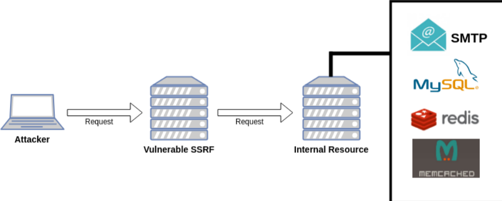 如图,攻击者从外网通过 SSRF 攻击访问到内网,接着对内网的应用展开攻击,这些应用包括但不限于 MySQL,redis,SMTP 等等 ……
